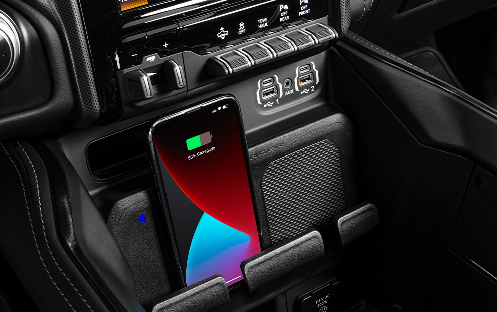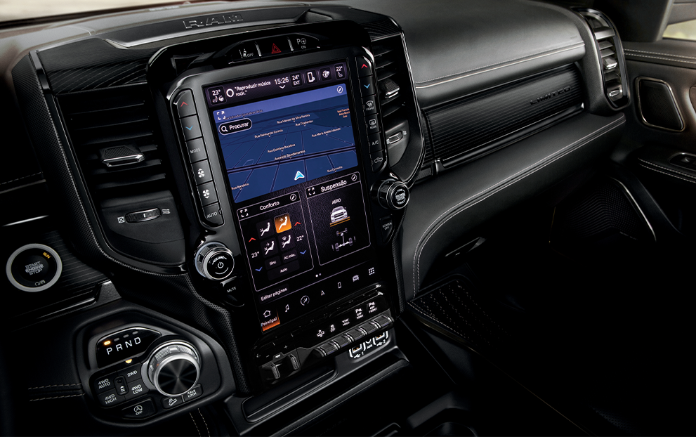 A Central Multimídia U-Connect 5 de 12 polegadas vem com Apple CarPlay e Android Auto com conexão sem fio. Além de contar com navegação embarcada e maior tela do segmento, também permite conexão simultânea com 2 smartphones.